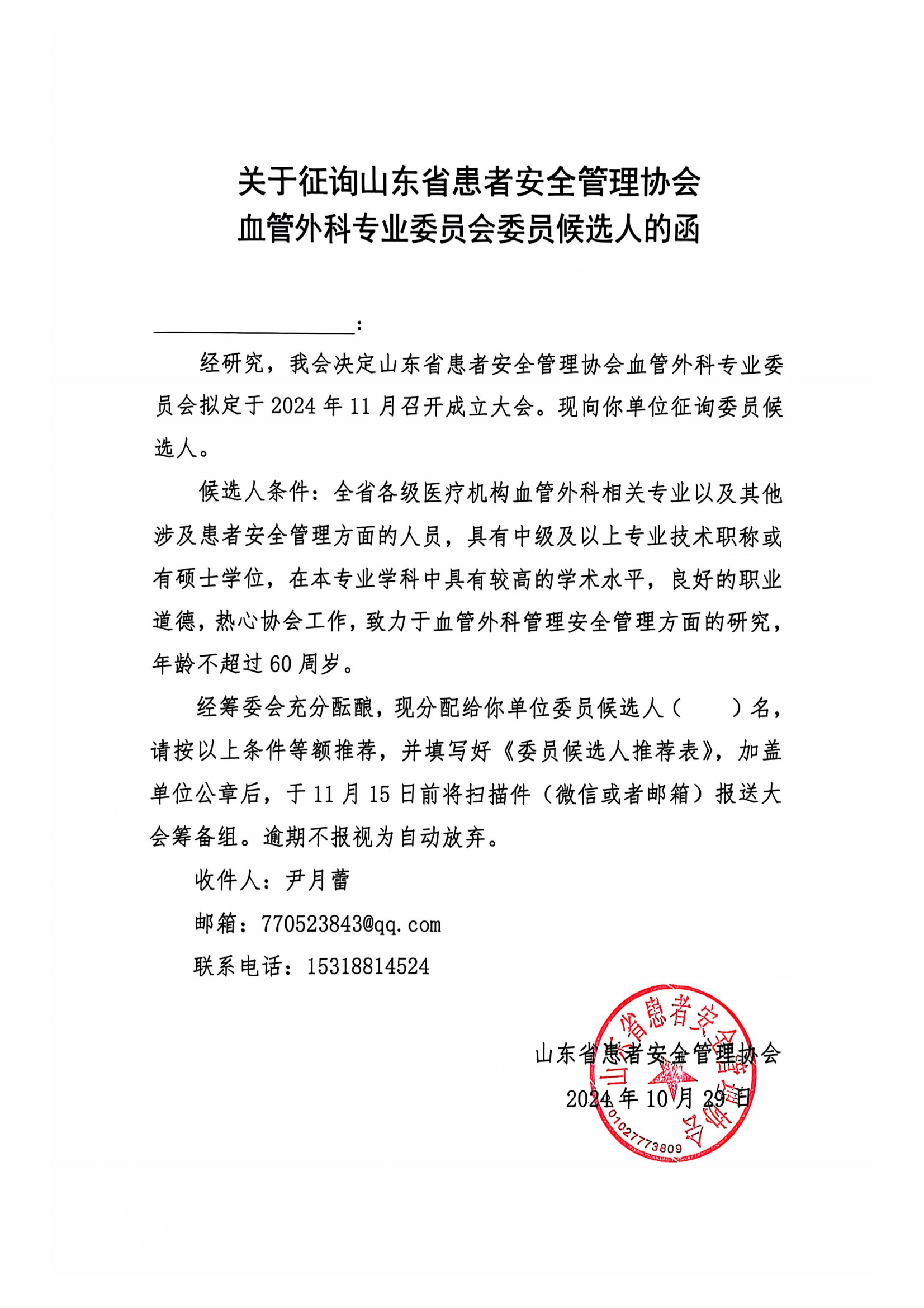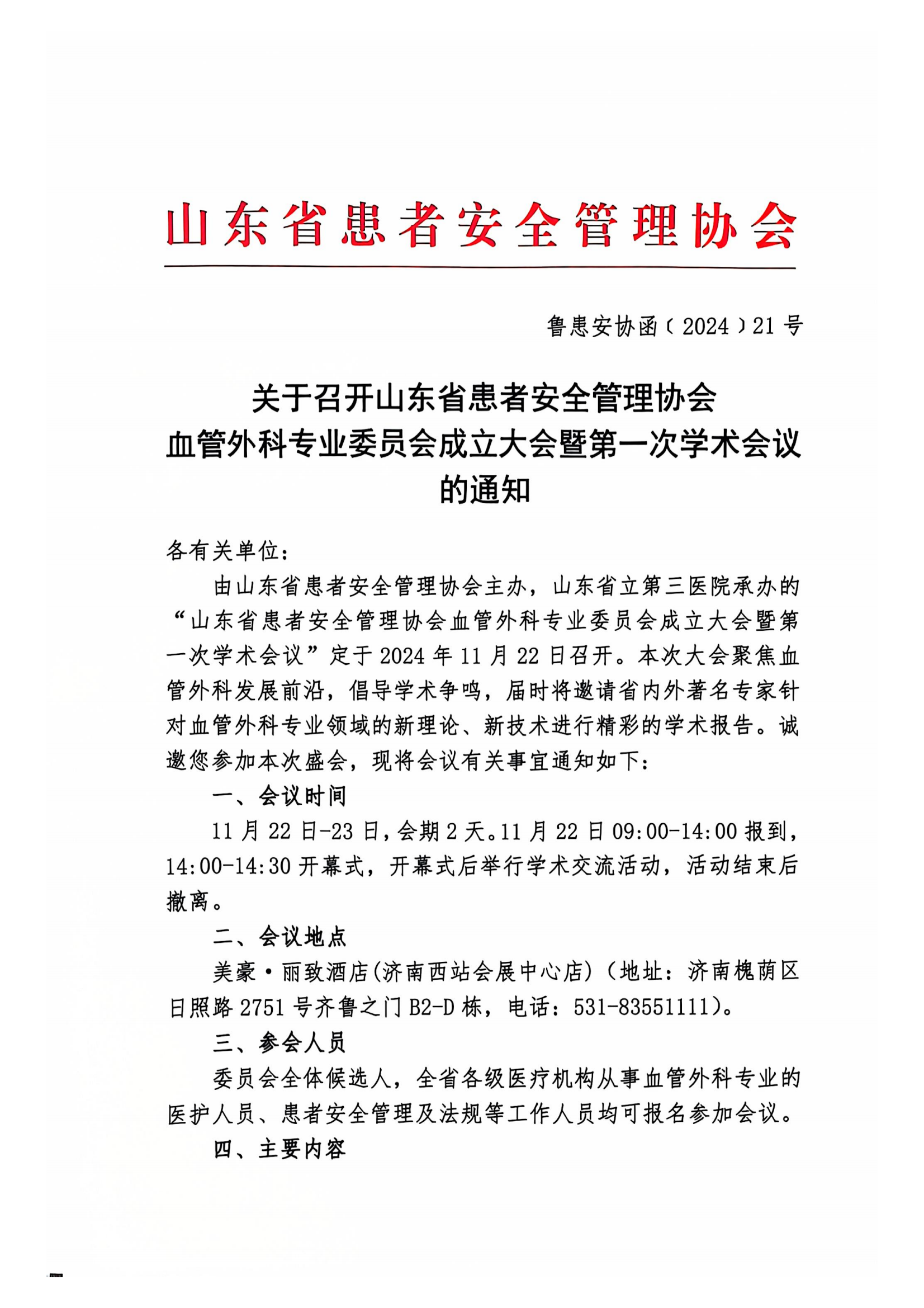 关于召开山东省患者安全管理协会血管外科专业委员会成立大会暨第一次学术会议的通知