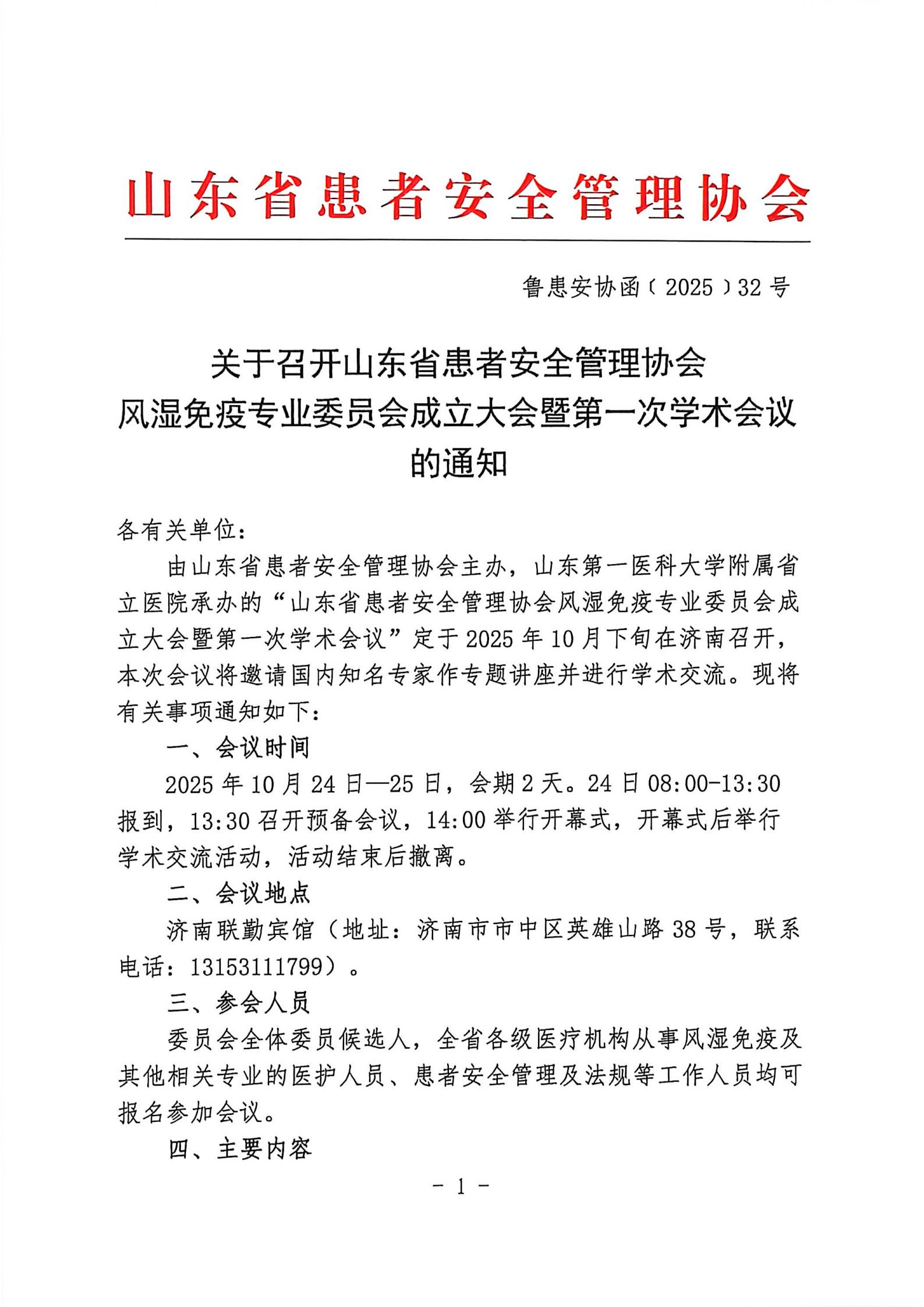 关于召开山东省患者安全管理协会风湿免疫专业委员会成立大会暨第一次学术会议的通知