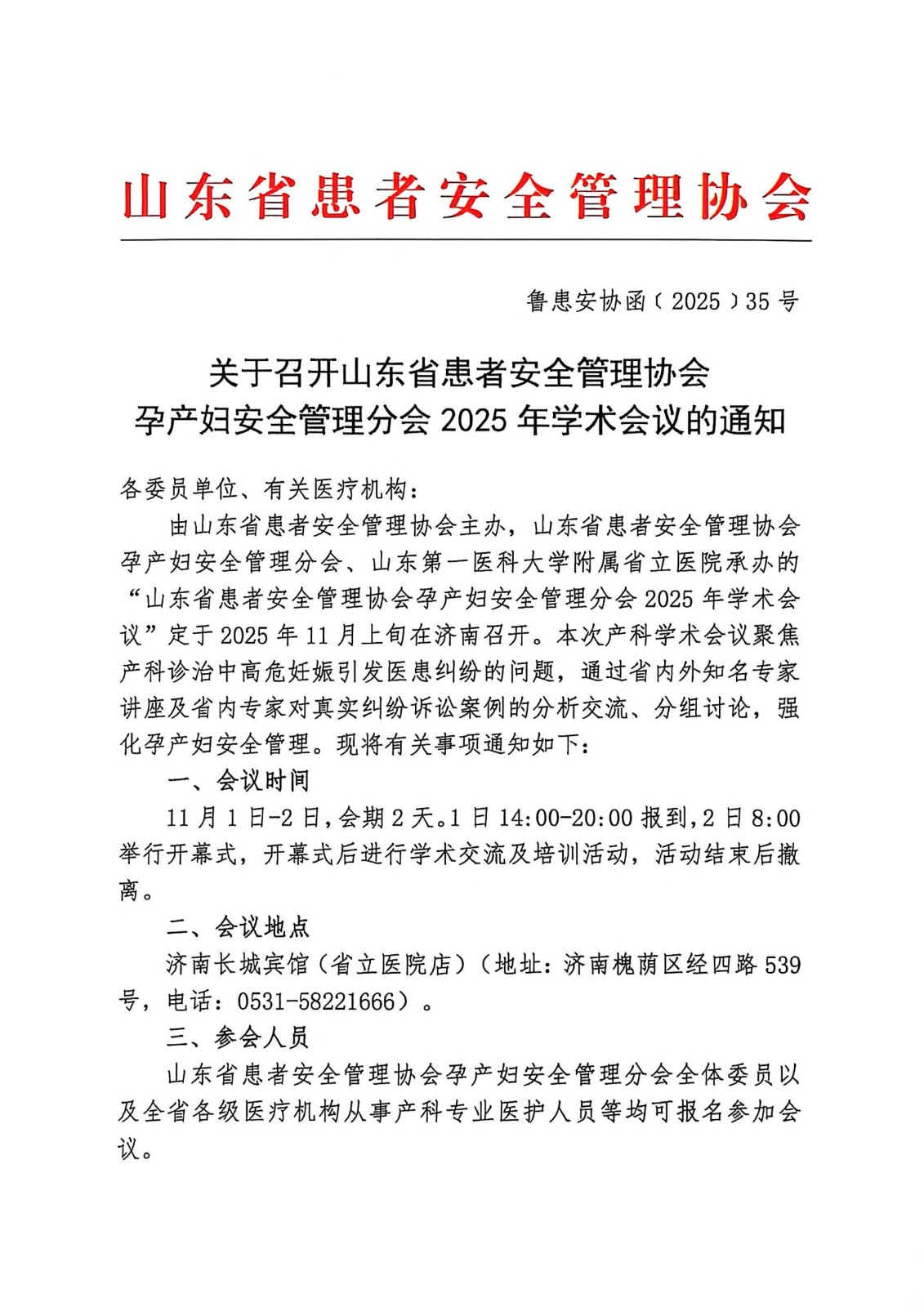 关于召开山东省患者安全管理协会孕产妇安全管理分会2025年学术会议的通知