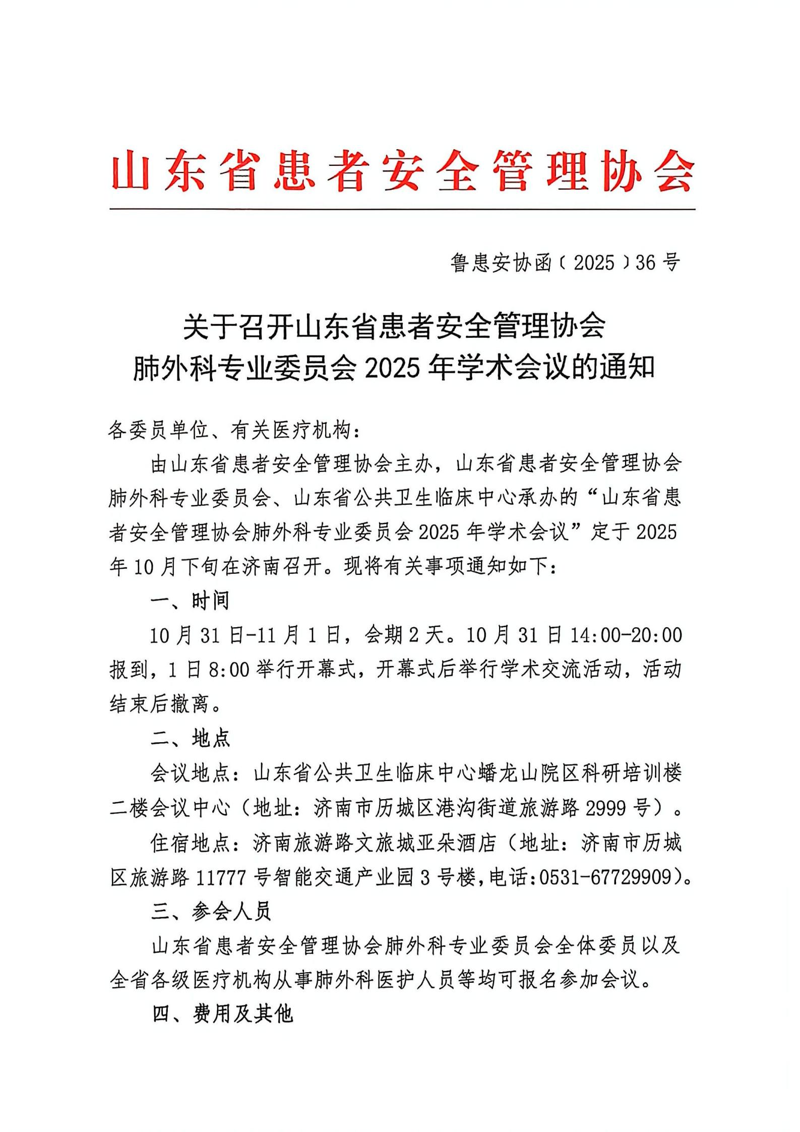 关于召开山东省患者安全管理协会肺外科专业委员会2025年学术会议的通知