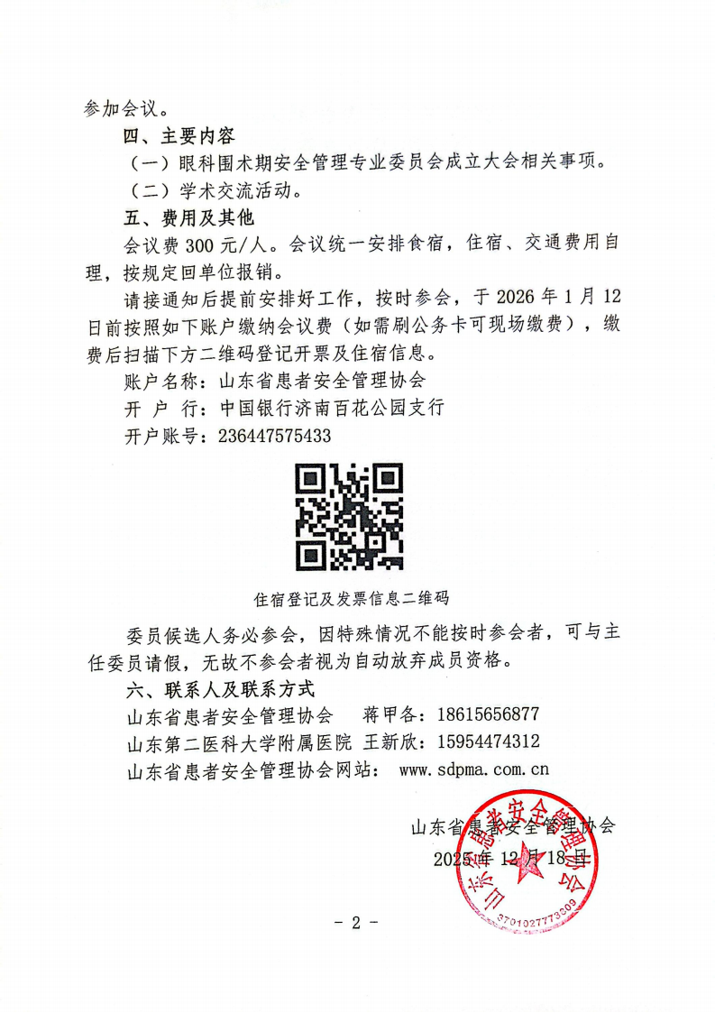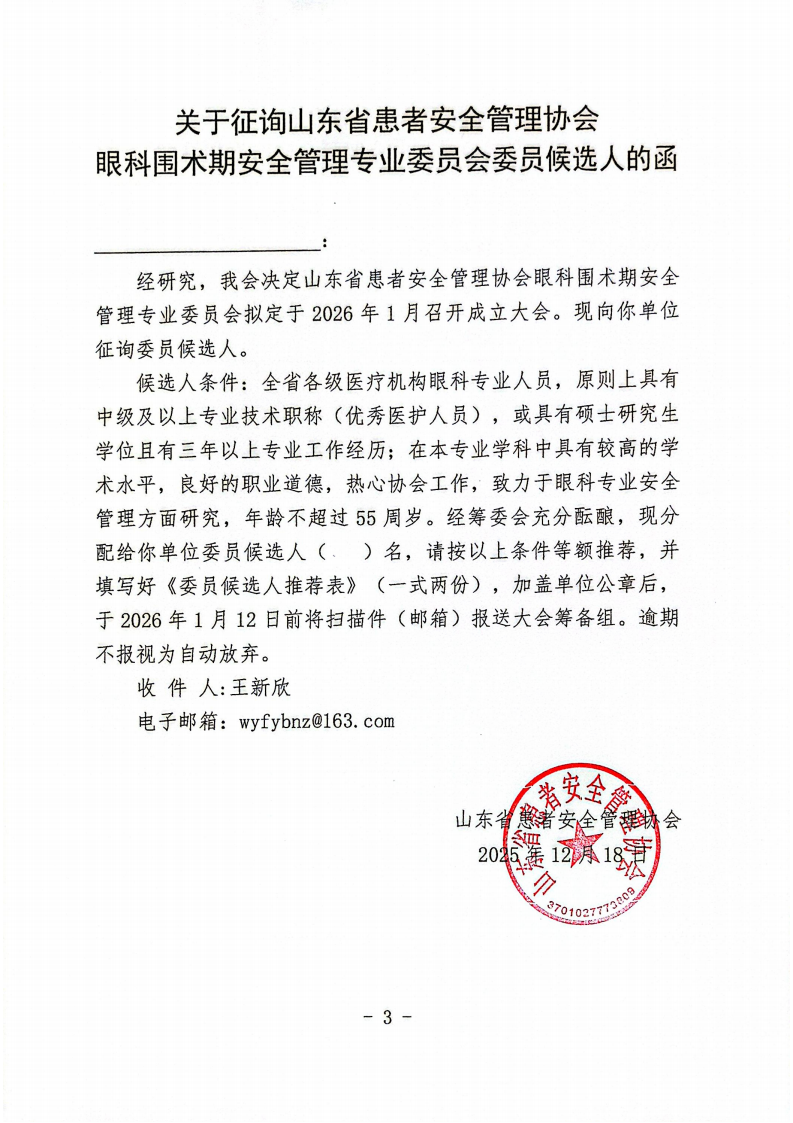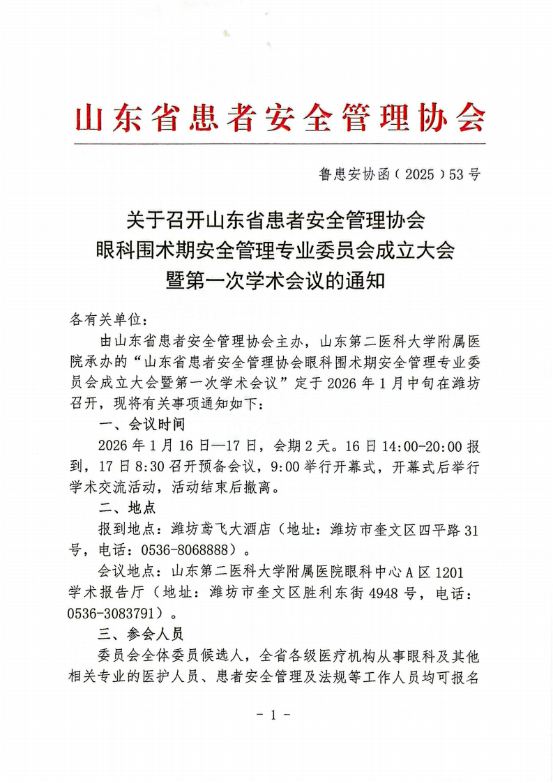 关于召开山东省患者安全管理协会眼科围术期安全管理专业委员会成立大会暨第一次学术会议的通知