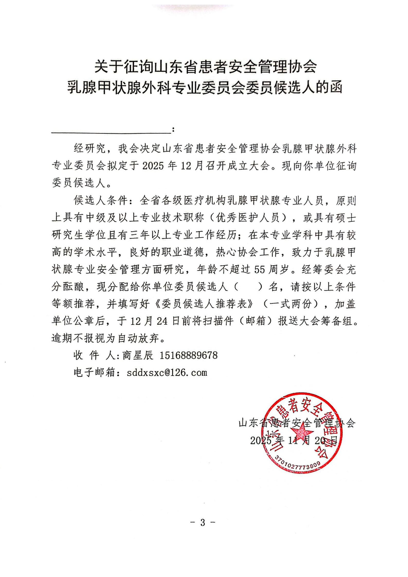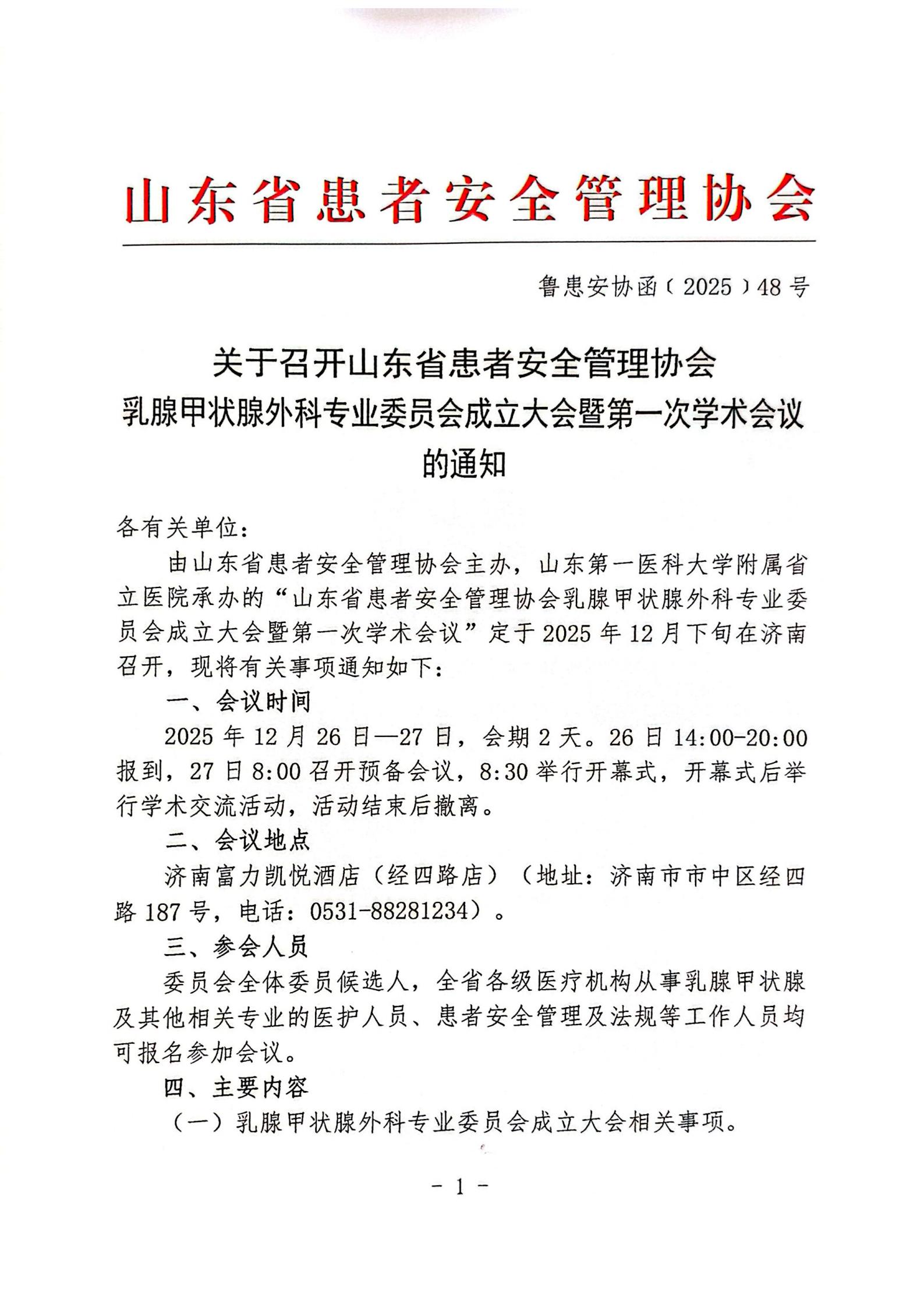 关于召开山东省患者安全管理协会乳腺甲状腺外科专业委员会成立大会暨第一次学术会议的通知