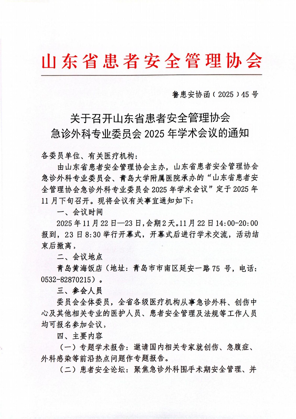 关于召开山东省患者安全管理协会急诊外科专业委员会2025年学术会议的通知